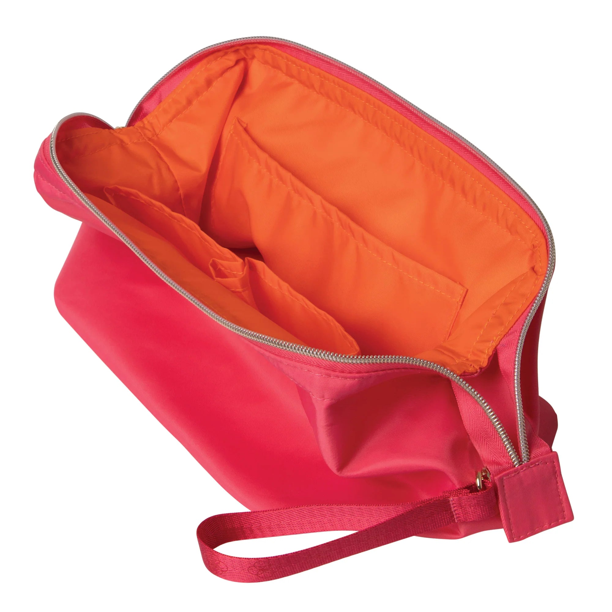 Featuring a unique wireframe construction, this large cosmetic bag remains open while in use so you can find your favourite products with ease. The interior of the makeup bag also includes 3 pouch pockets in a fun and playful contrast Orange tone.