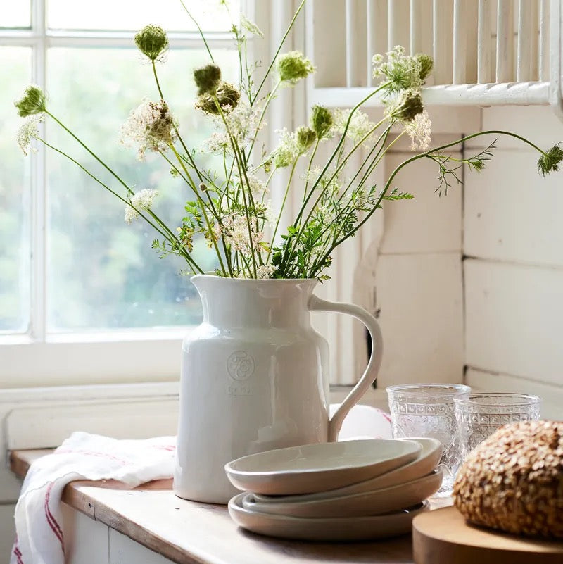 Perfectly simple rustic white jug makes an elegant water jug or vessel for your more ambitious flower arrangements.