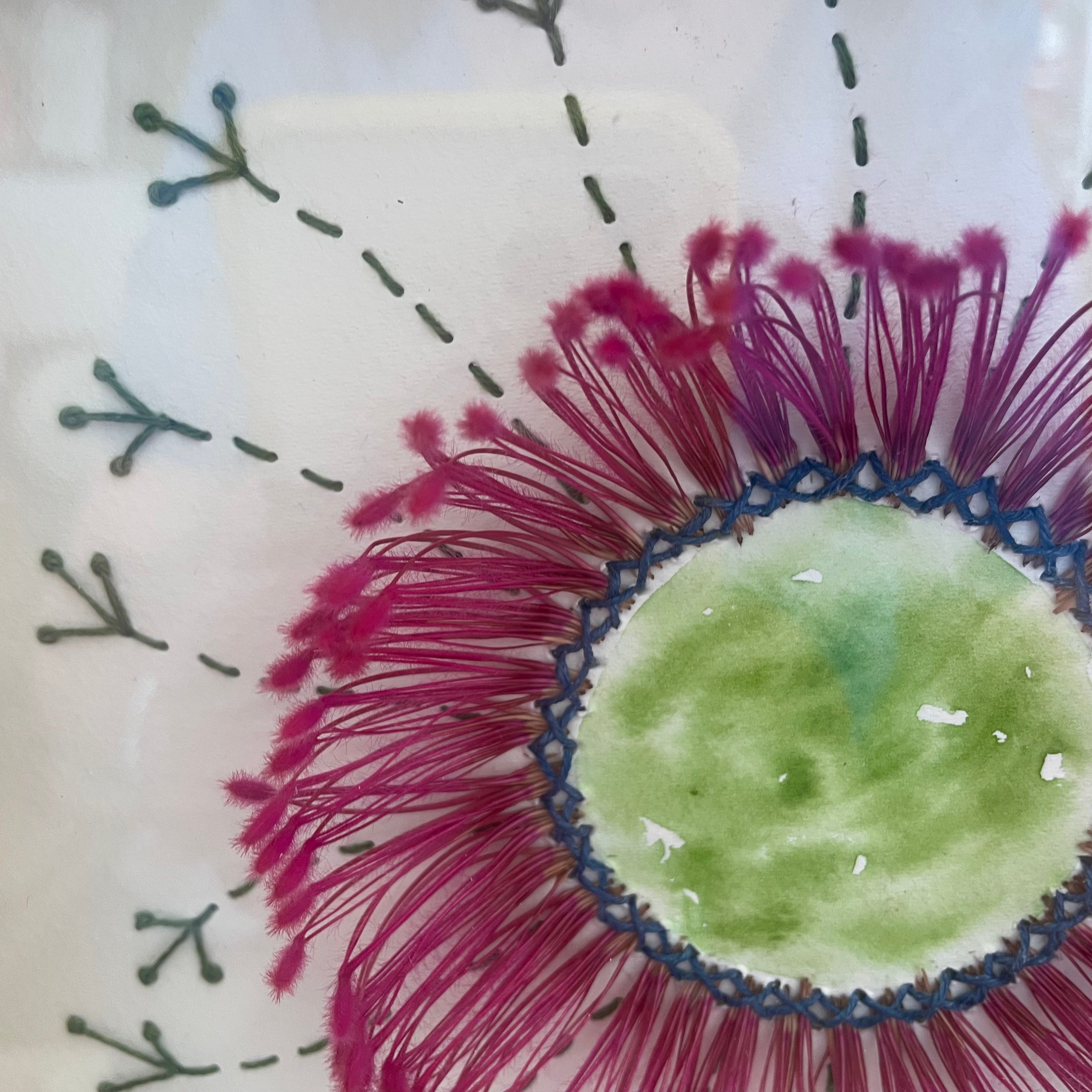 My unique form of fibre art provides the view with a new perspective of the beauty of Australian native flora. This delicate piece is created with dried banksia stamen which are hand stitched with natural fibres onto cotton rag paper, with hand stitching & watercolour details.