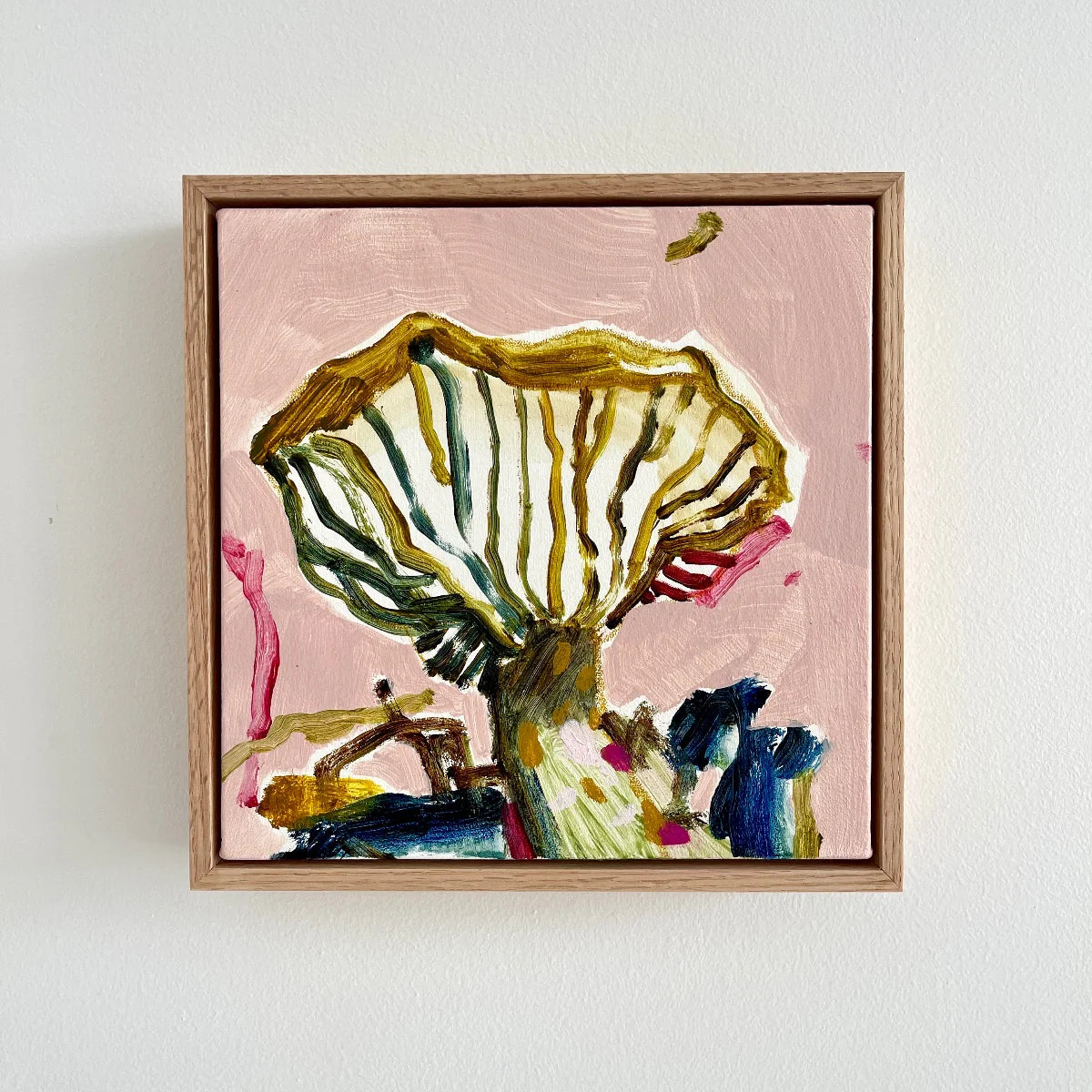Framed in raw oak.