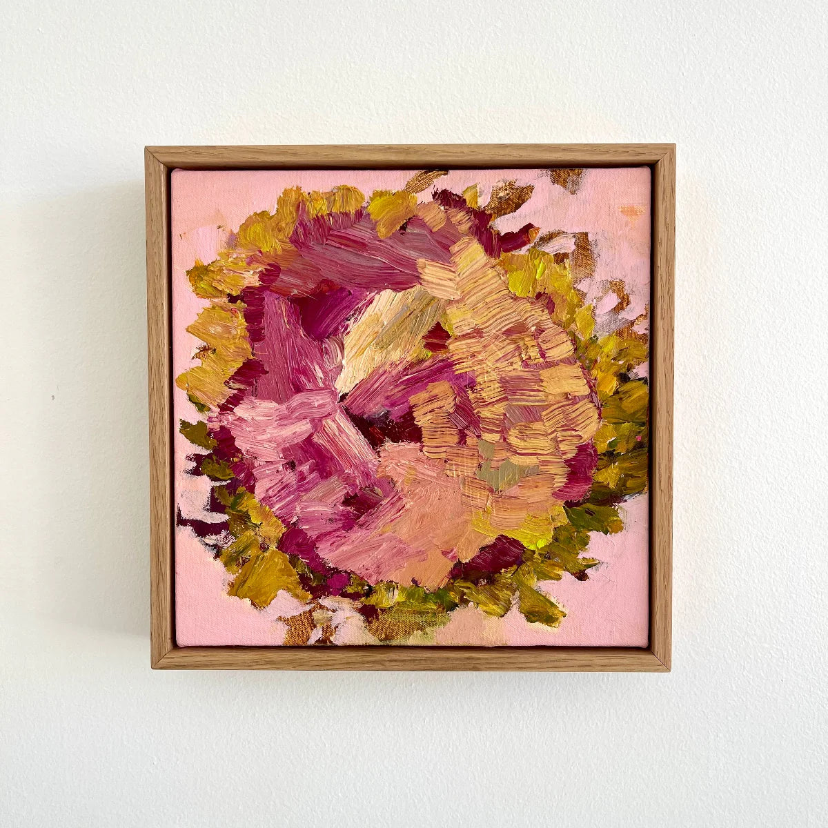 Framed in raw oak.