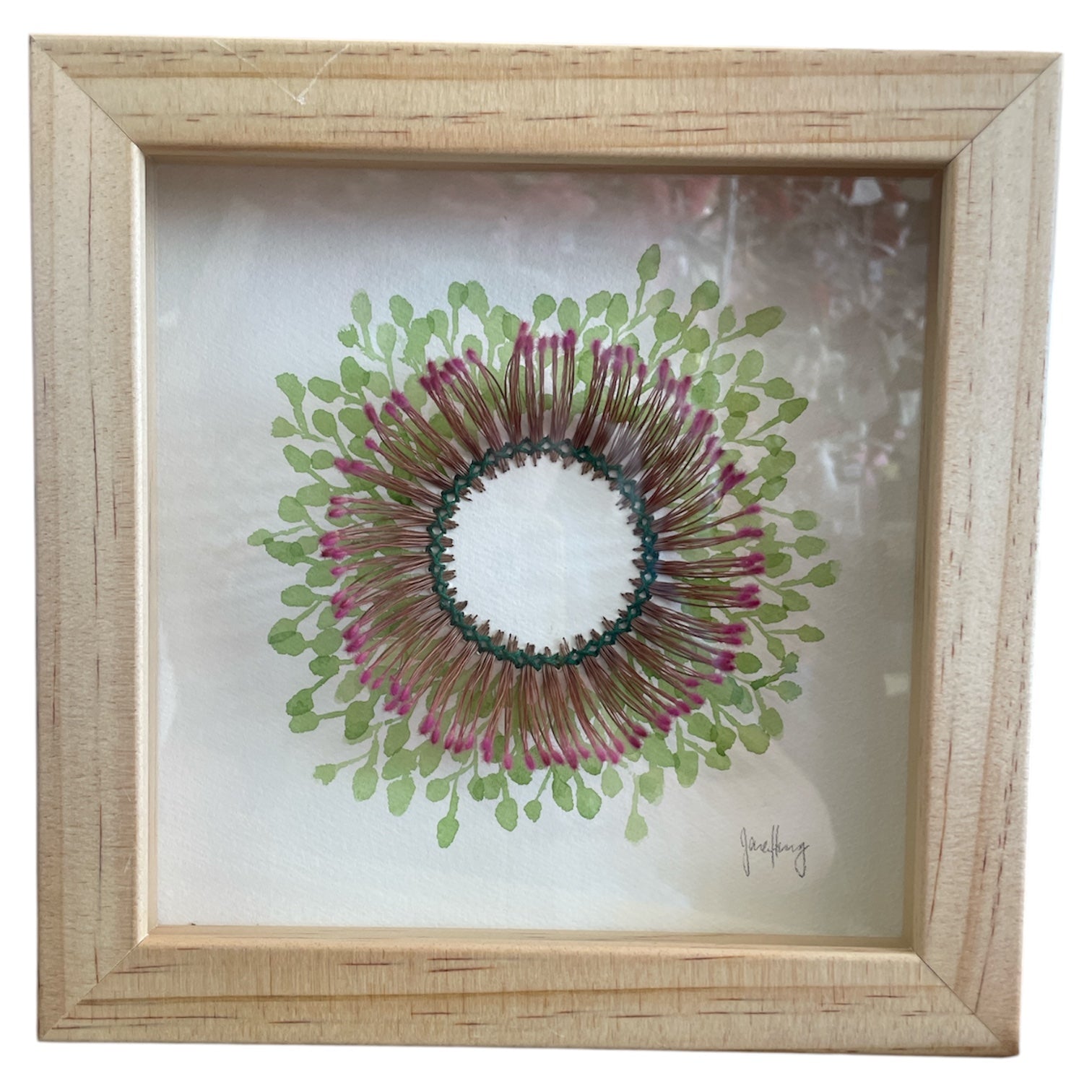 Inspired by a love of Australian native flora and the disciplined skill of slow needlework, this colourful piece is created with dried banksia stamen, which are hand stitched with natural fibres onto cotton rag paper, with watercolour details.