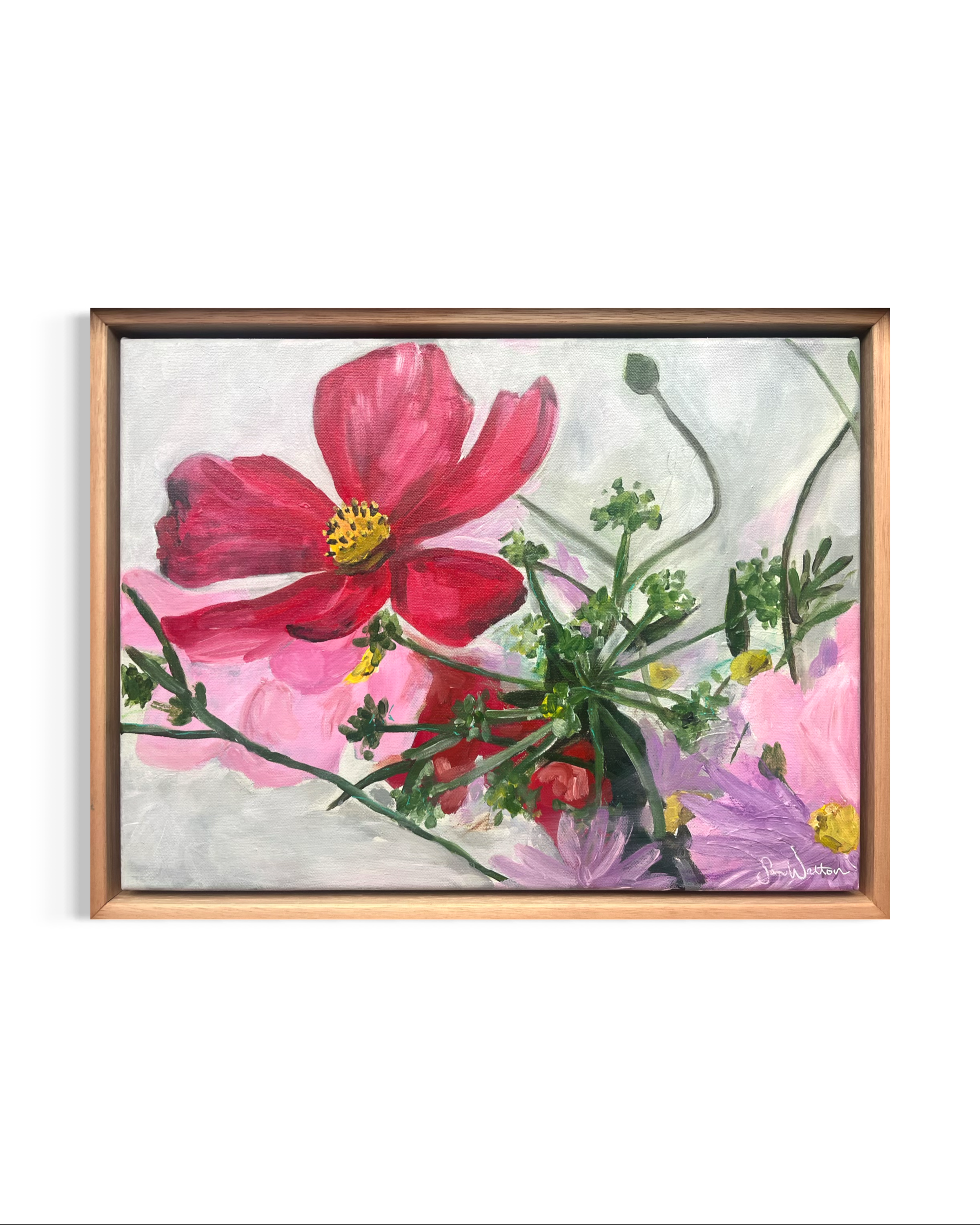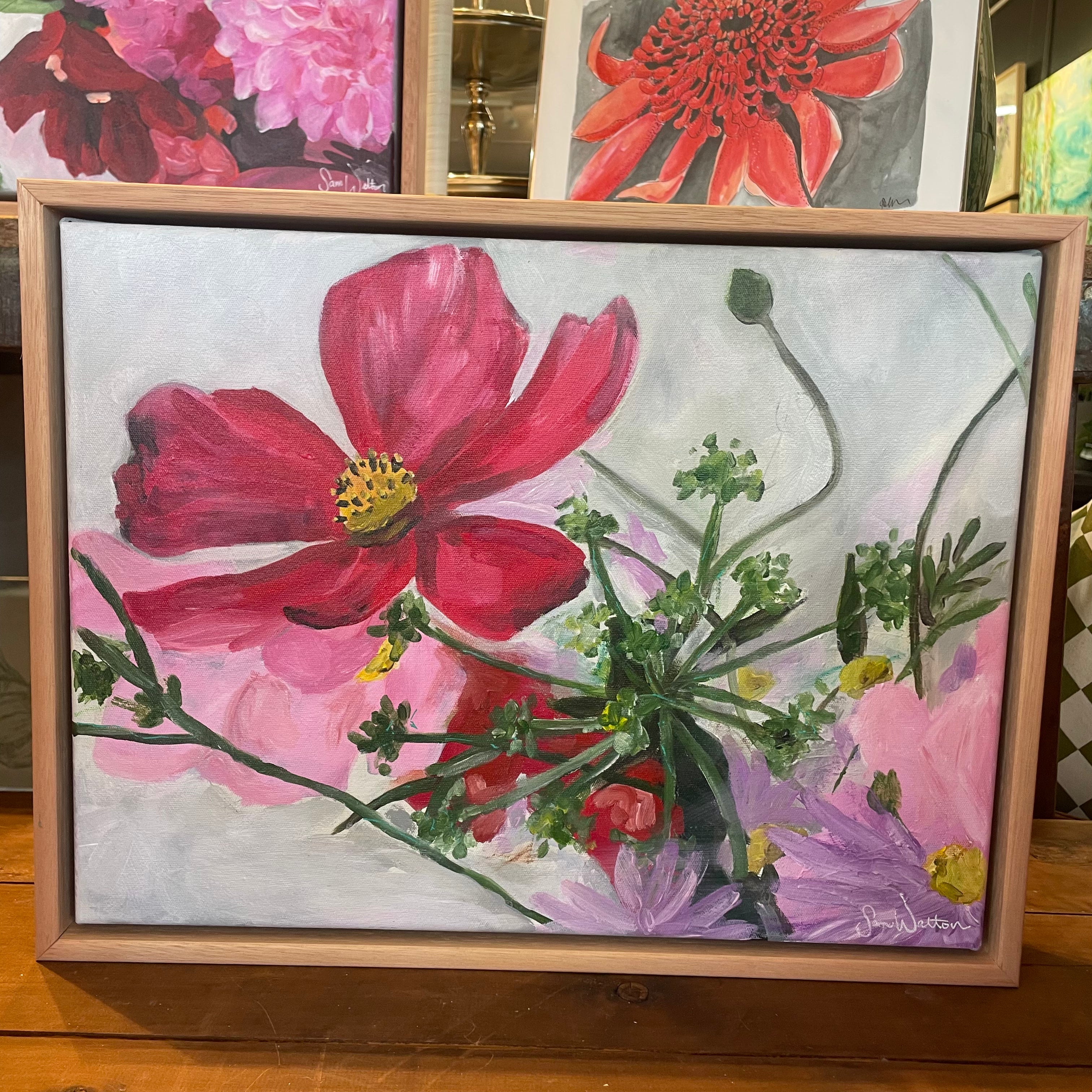 A bold red bloom emerges against softer pinks and greens, drawing the eye through delicate stems and flowing forms. This piece balances strength and softness through contrast and gesture.