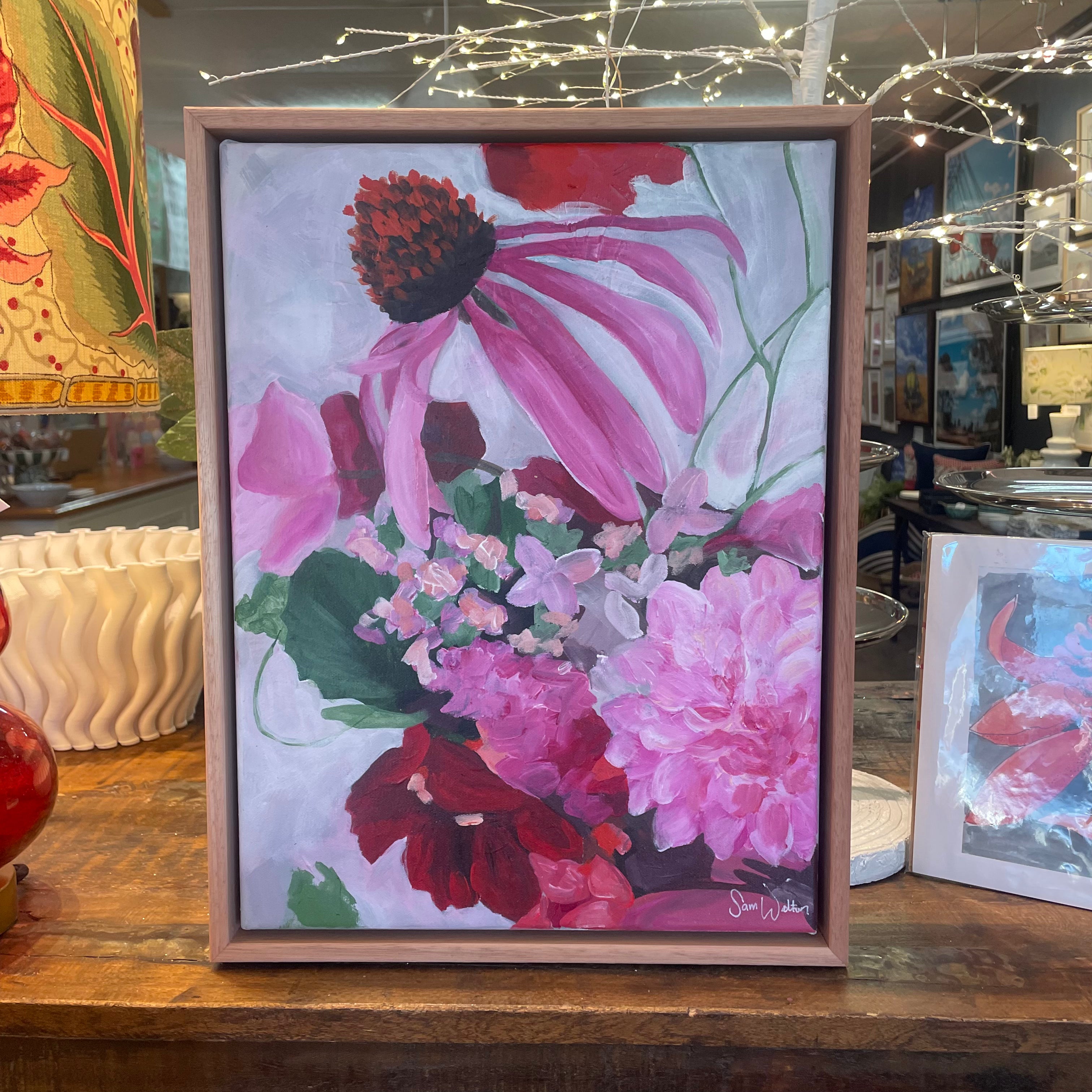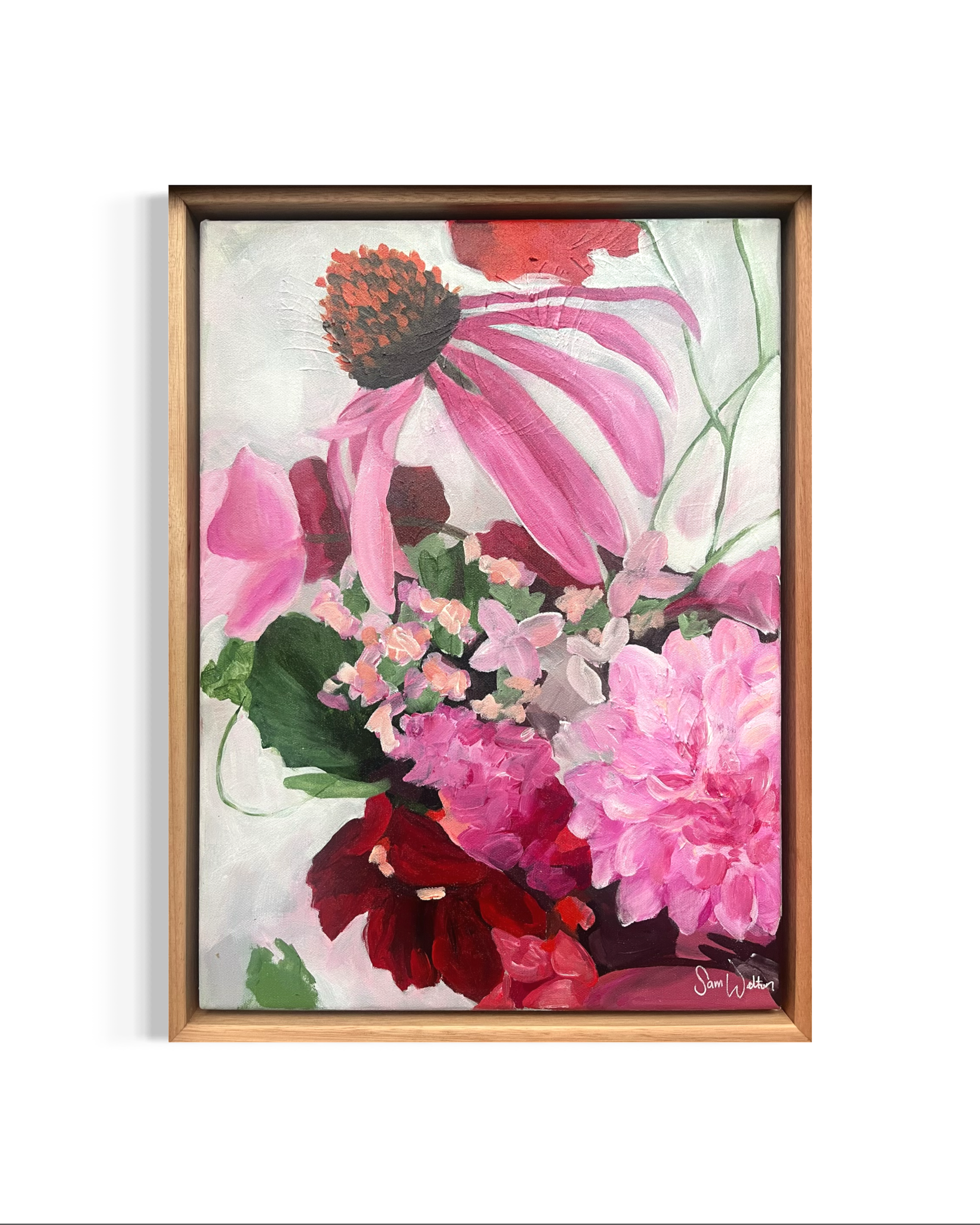 Loose, expressive brushstrokes bring together pinks, reds, and soft greens in a layered floral arrangement. The composition feels playful and intuitive, celebrating colour and imperfection.