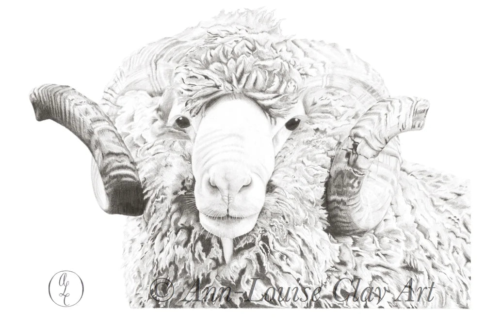 This drawing is derived from a photo Ann-Louise found while on Instagram. The ram was bred on a Merino stud called "Salt Creek" in Woorndoo, Victoria. The Coy family have been breeding super fine merino wool of 18-16 micron for the last 110 years in Woorndoo.