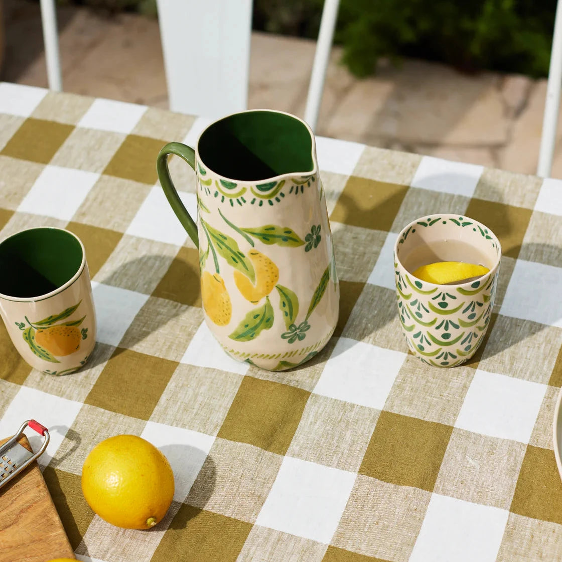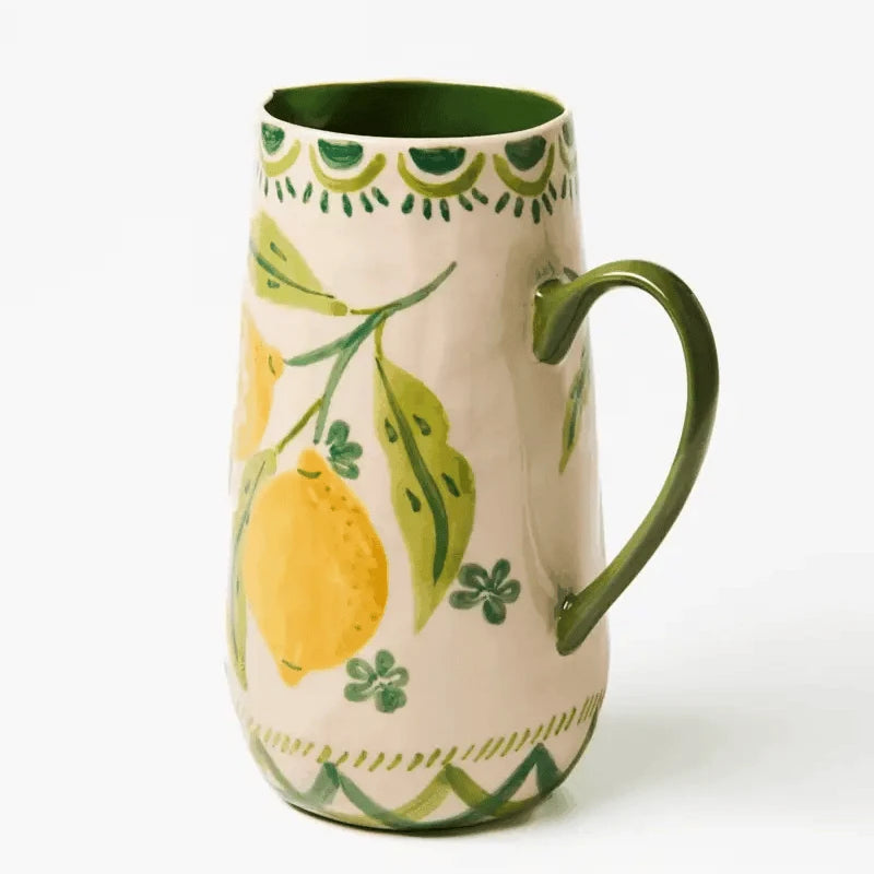 Sun-drenched lemons dance across this generous pitcher, their vibrant hues hand-painted against creamy earthenware. Designed with gatherings in mind, the emerald interior creates a striking contrast as you pour limoncello or wine for friends around outdoor tables. Lovely used in company with the Tavola cups, even by the bedside in Summer.