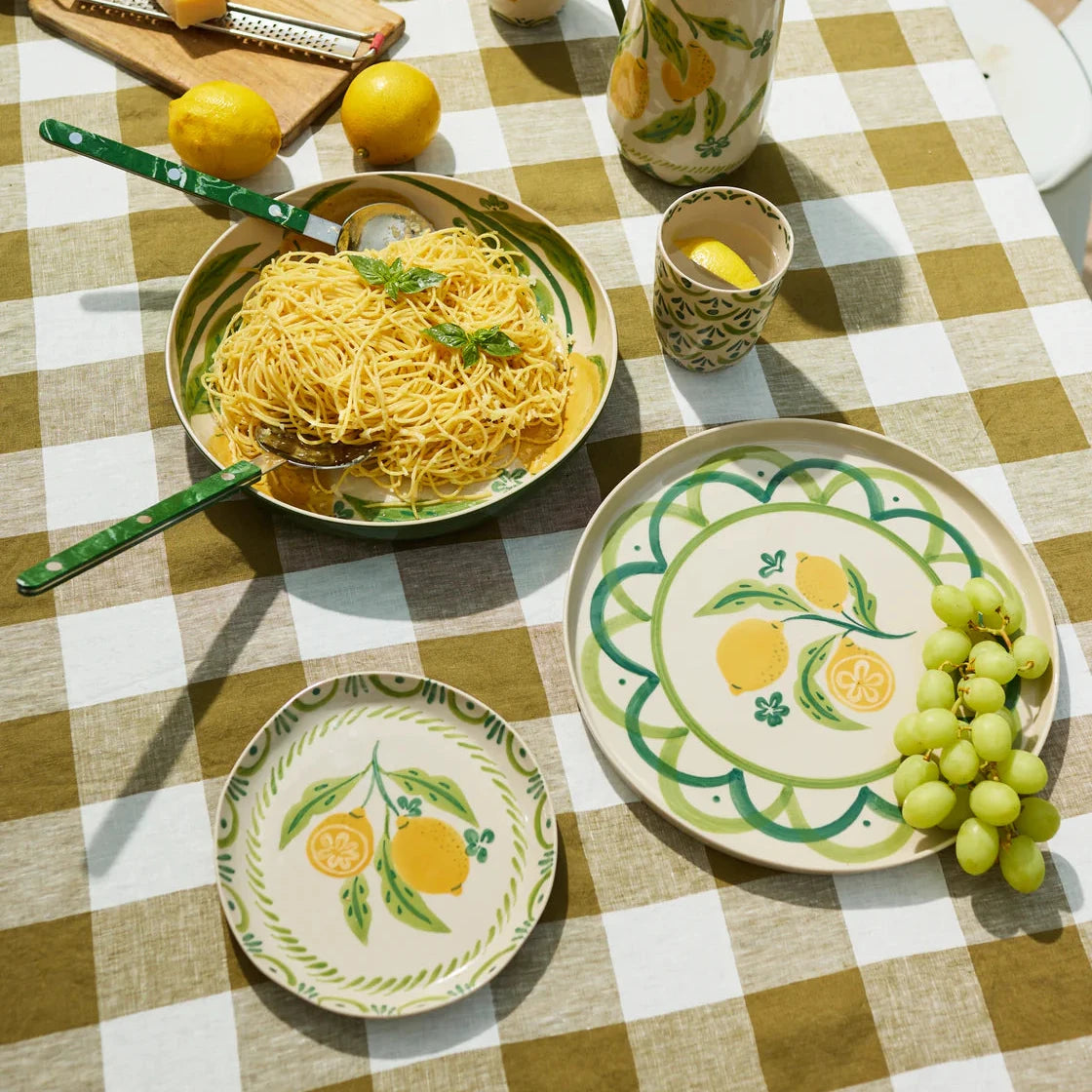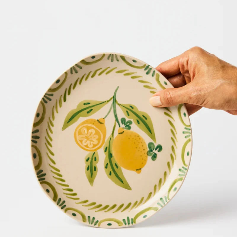 Two perfect lemons, captured in various states of repose, create a visual rhythm on this earthenware plate. Hand-painted with verdant leaves and ochre fruit, each brushstroke reveals the artisan's touch. Its size making it perfect for snacking or small meals, we even love it hung on the wall in the kitchen.