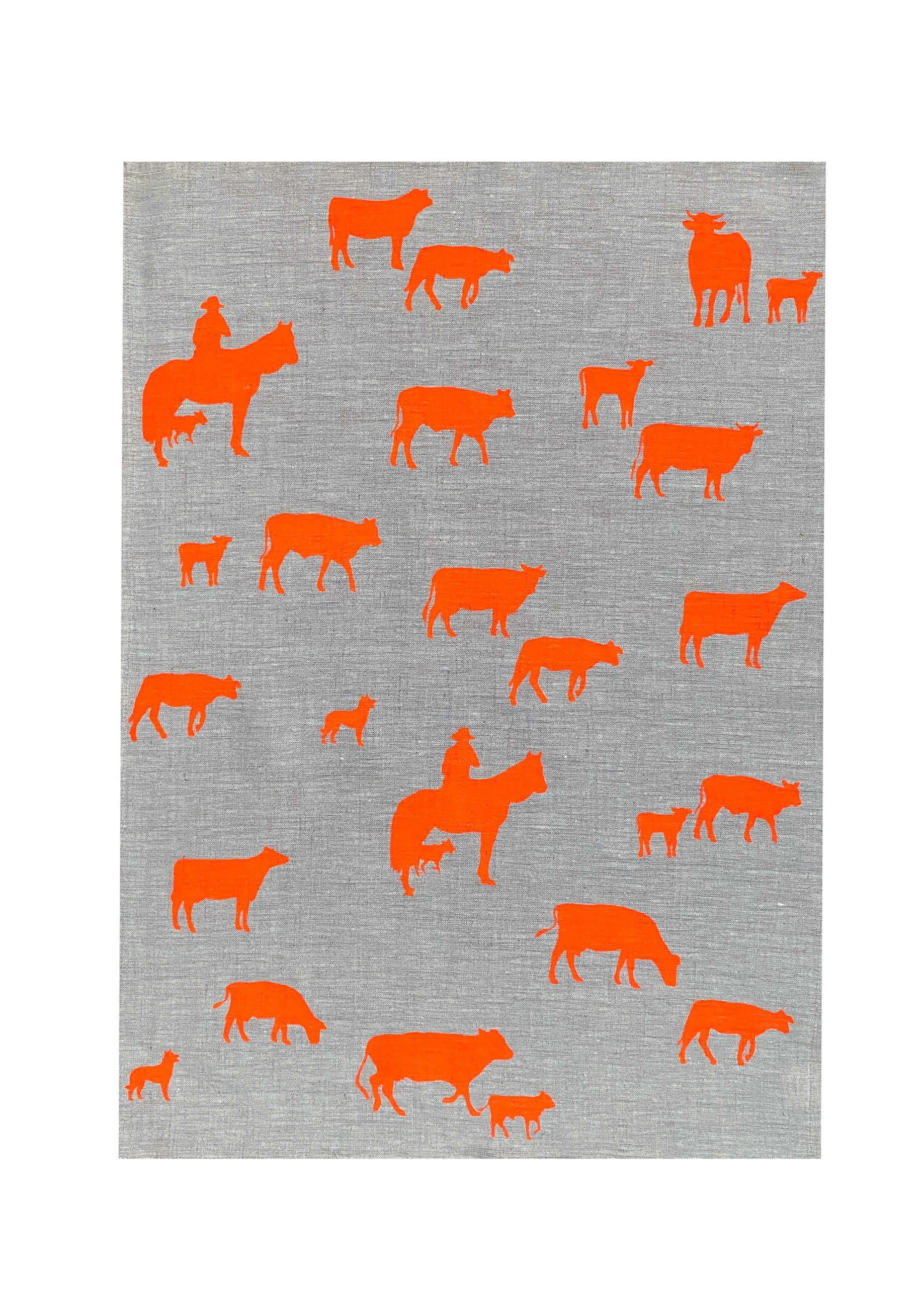Our Muster design featuring cattle, stockmen and dogs is hand screen printed in neon orange ink onto off-white or natural linen