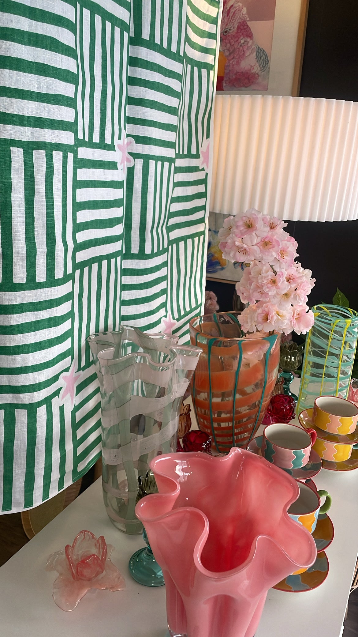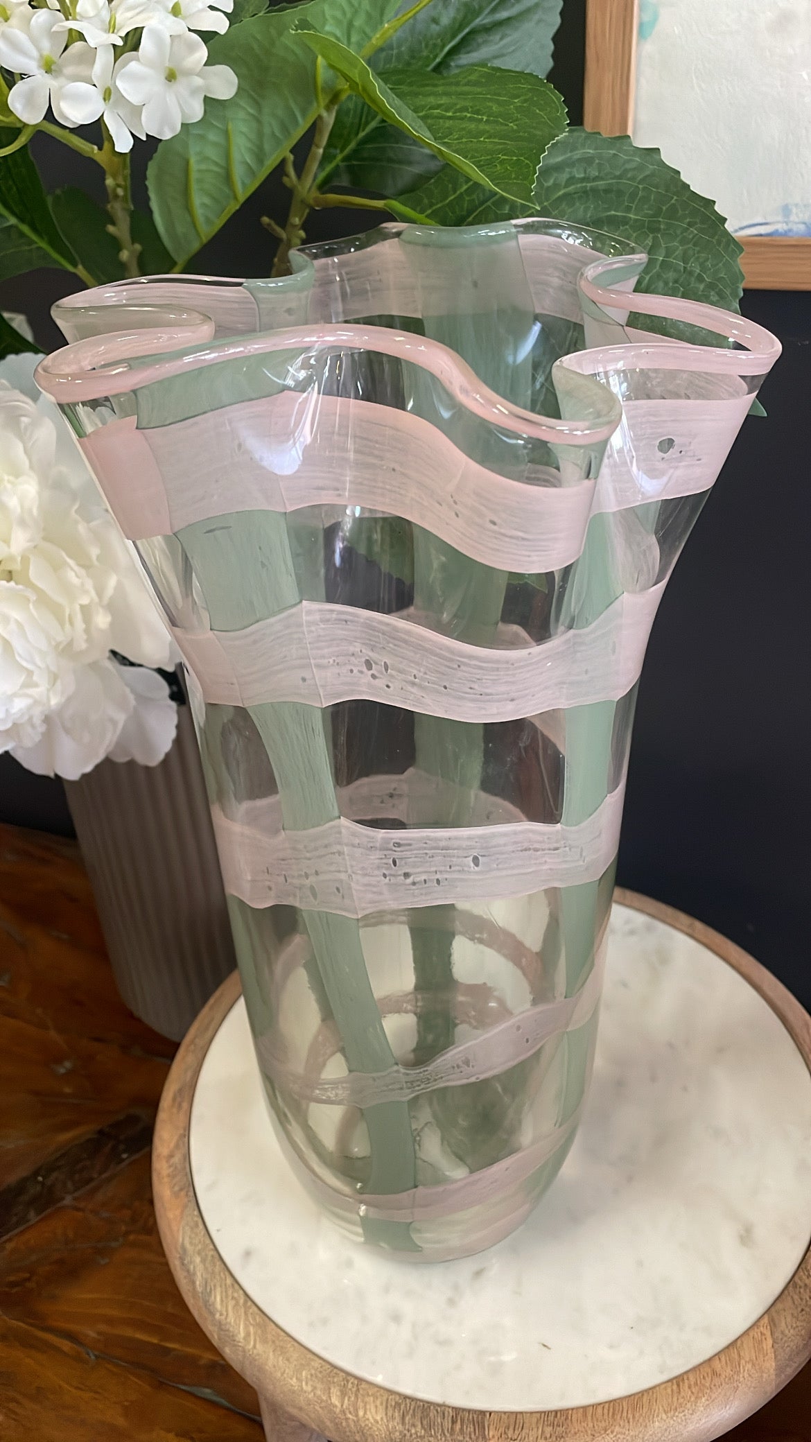 Vivid Frilled Glass Vase designed by Ben David. An exquisite fusion of elegance and contemporary design. This unique vase boasts a captivating check pattern that adds a dynamic touch to your decor. A striking centrepiece for any space.